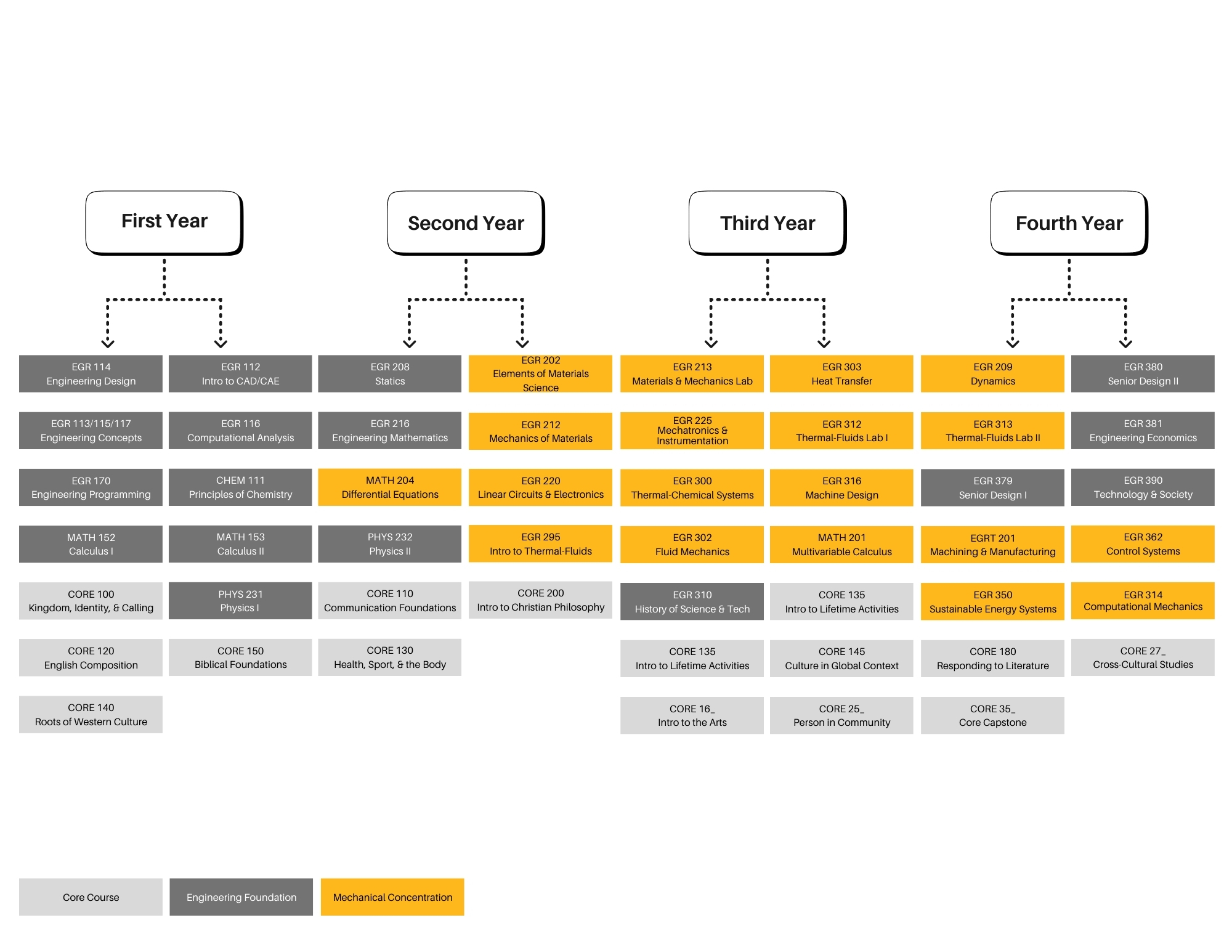 Students who choose the mechanical engineering concentration will complete 12 engineering courses and one elective from a selection of engineering options. This coursework will include at least four additional credit hours of lab work.