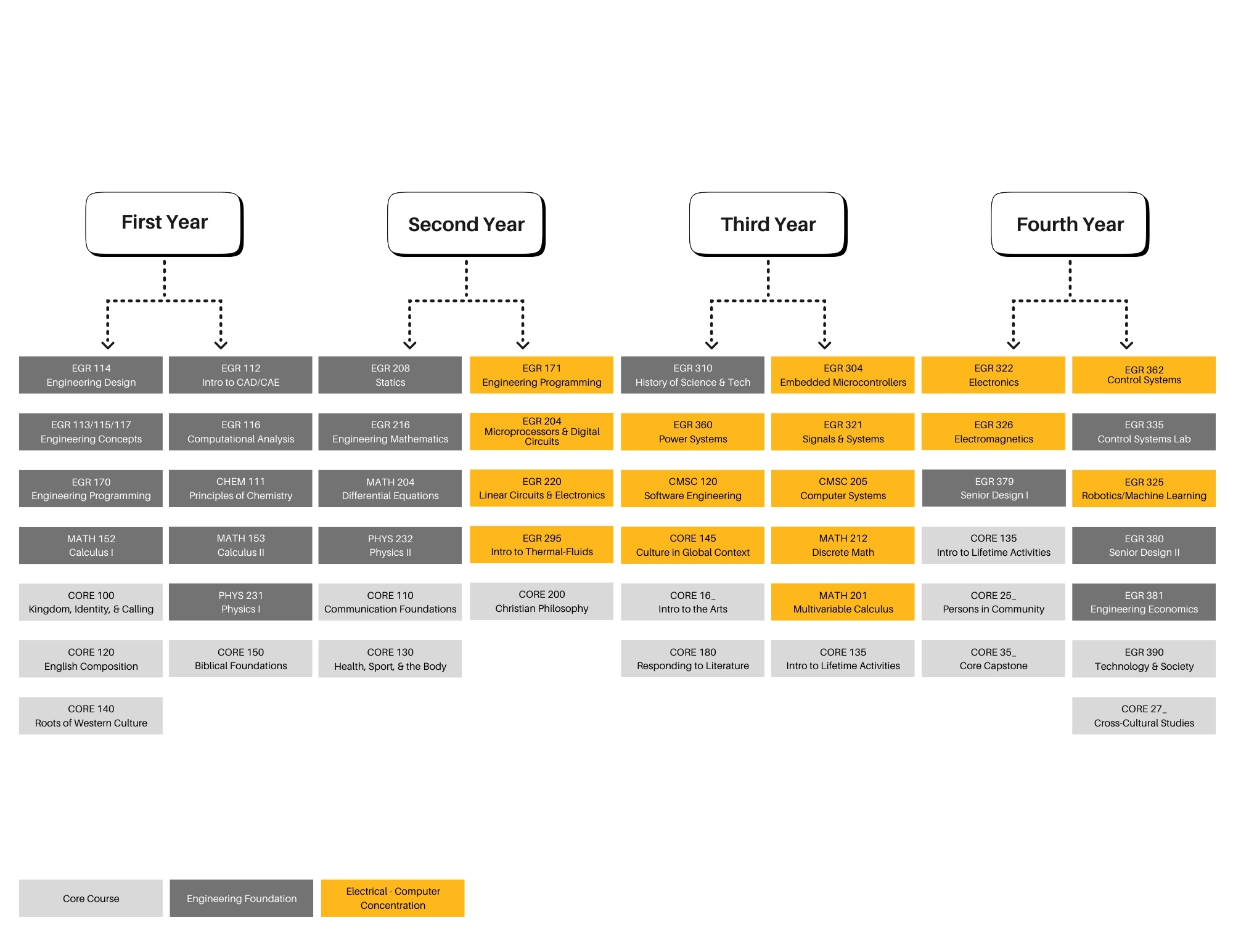 Those who choose the computer engineering concentration will complete two engineering courses, four computer science courses, and two courses from a special selection of engineering and computer science courses, in addition to completing the general requirements for an engineering degree.