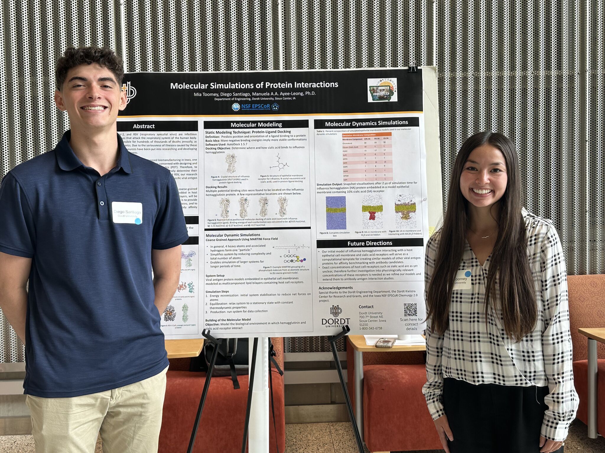 Dordt engineering students Mia Toomey and Diego Santiago, supervised by Associate Professor of Engineering and Chemistry Dr. Manuela Ayee-Leong, participated in a summer research project titled “Molecular Simulations of Protein Interactions.” The main goal of the project was to create a computational model simulating how certain viruses, like SARS-CoV-2 and Influenza interact with the membranes of cells in the human respiratory tract, with the goal of more efficiently engineering antibodies for vaccines.