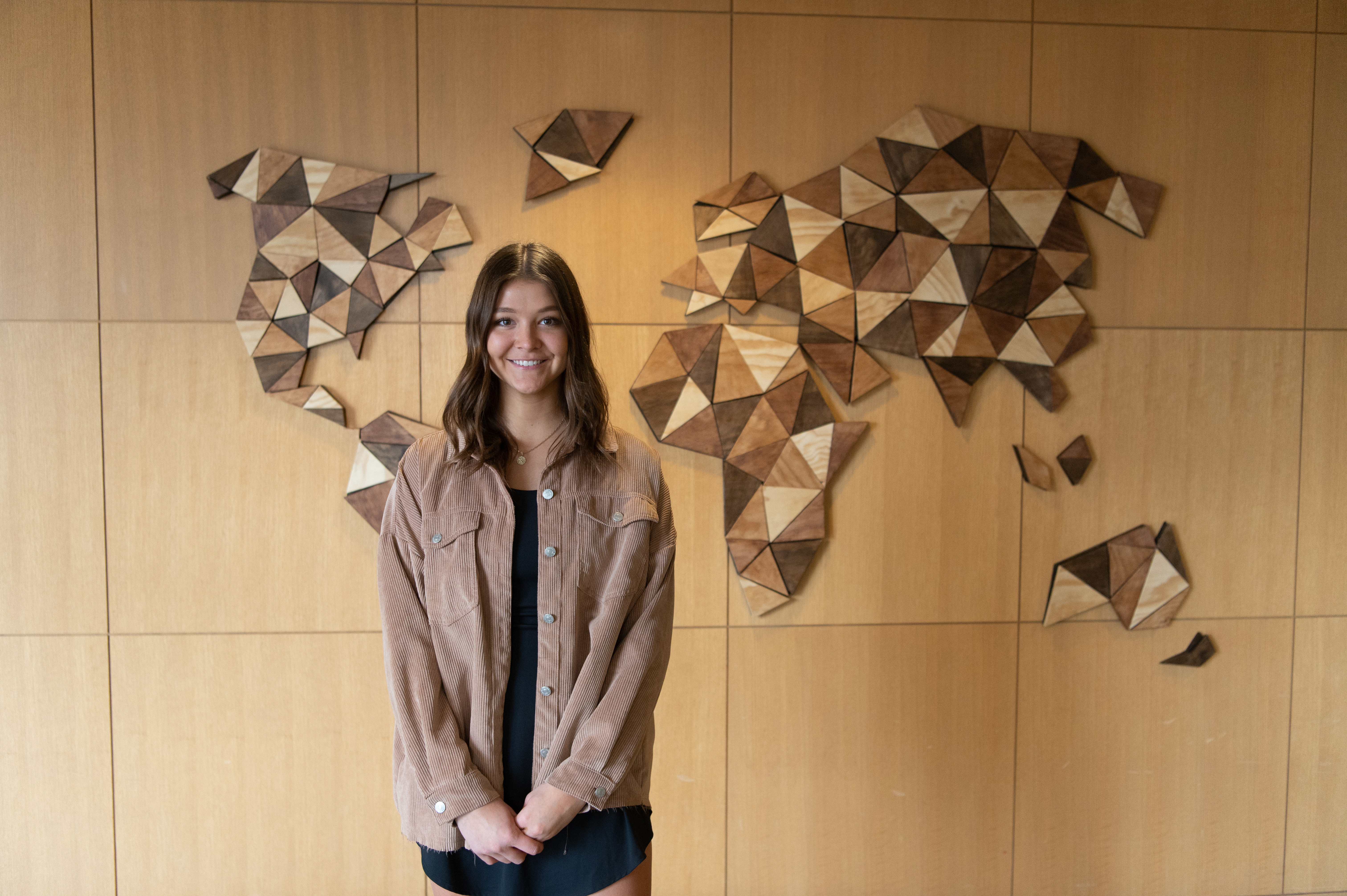 Dordt University senior art major Annabelle Vanderkooi of Abbotsford, British Columbia recently had her artwork installed in the Campus Center – "The Mosaic Masterpiece," a wooden mosaic of the world that reflects Romans 12:4-8: “We have many parts in the one body, and all these parts have different functions. In the same way, though we are many, we are one body in union with Christ, and we are all joined to each other as different parts of the body.”