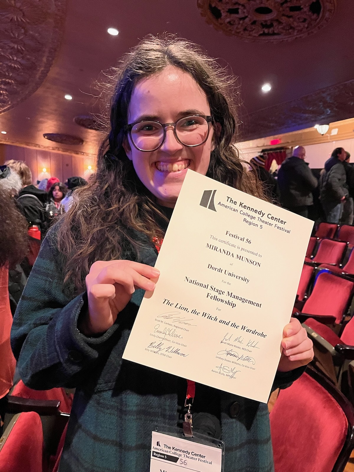 Not only did Miranda Munson, senior theatre arts: design and technical theatre major, receive a merit award by the Kennedy Center American College Theatre Festival (KCACTF) Region 5 in January, but her exceptional stage management work for the fall 2023 mainstage production of “The Lion, the Witch, and the Wardrobe” was selected to move on to the KCACTF National Festival in Washington, D.C. in mid-April.