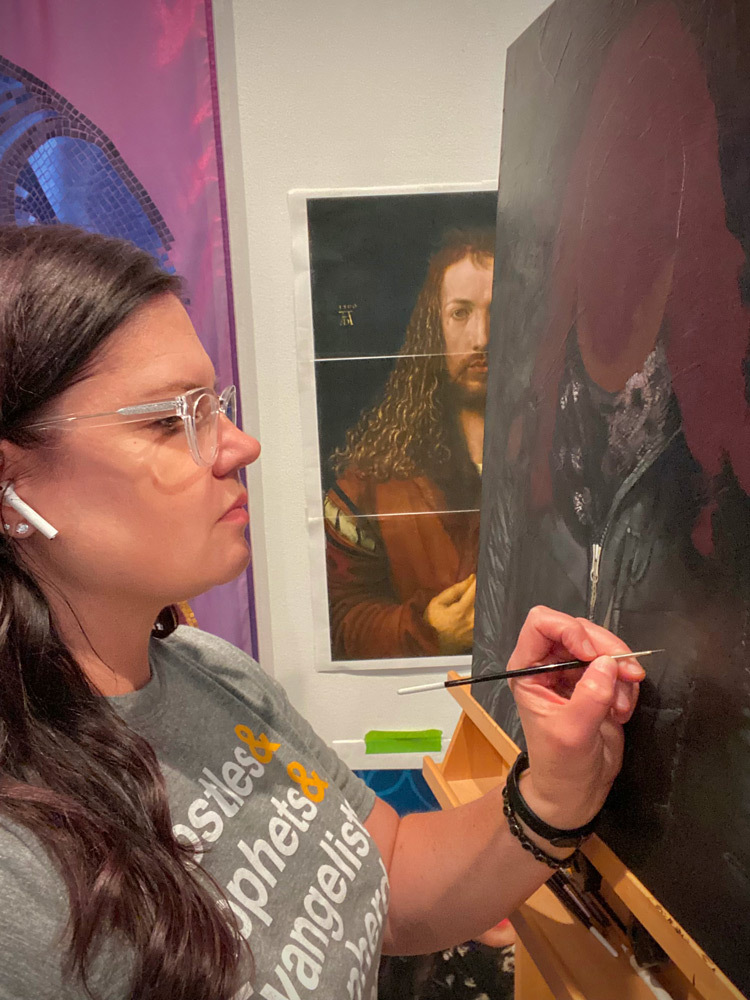 Hofer is also drawn to the contemplative aspect of iconography’s creation process. Reflecting on Scripture, a prayer or a particular liturgical season such as Advent while working is part of Hofer’s practice. One example of this is her unfinished midlife self-portrait inspired by renowned artist Albrecht Dürer. Hofer is intending this piece—which is a reflection on her own spiritual growth—to take a decade or more to complete.