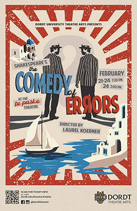 The Dordt University Theatre Arts Department will present William Shakespeare’s “The Comedy of Errors,” directed by Professor of Theatre Arts Laurel Koerner, at the Te Paske Theatre on February 21-24 at 7:30 p.m., as well as on February 24 at 2 p.m. Tickets may be purchased at https://dordt.ticketleap.com/.